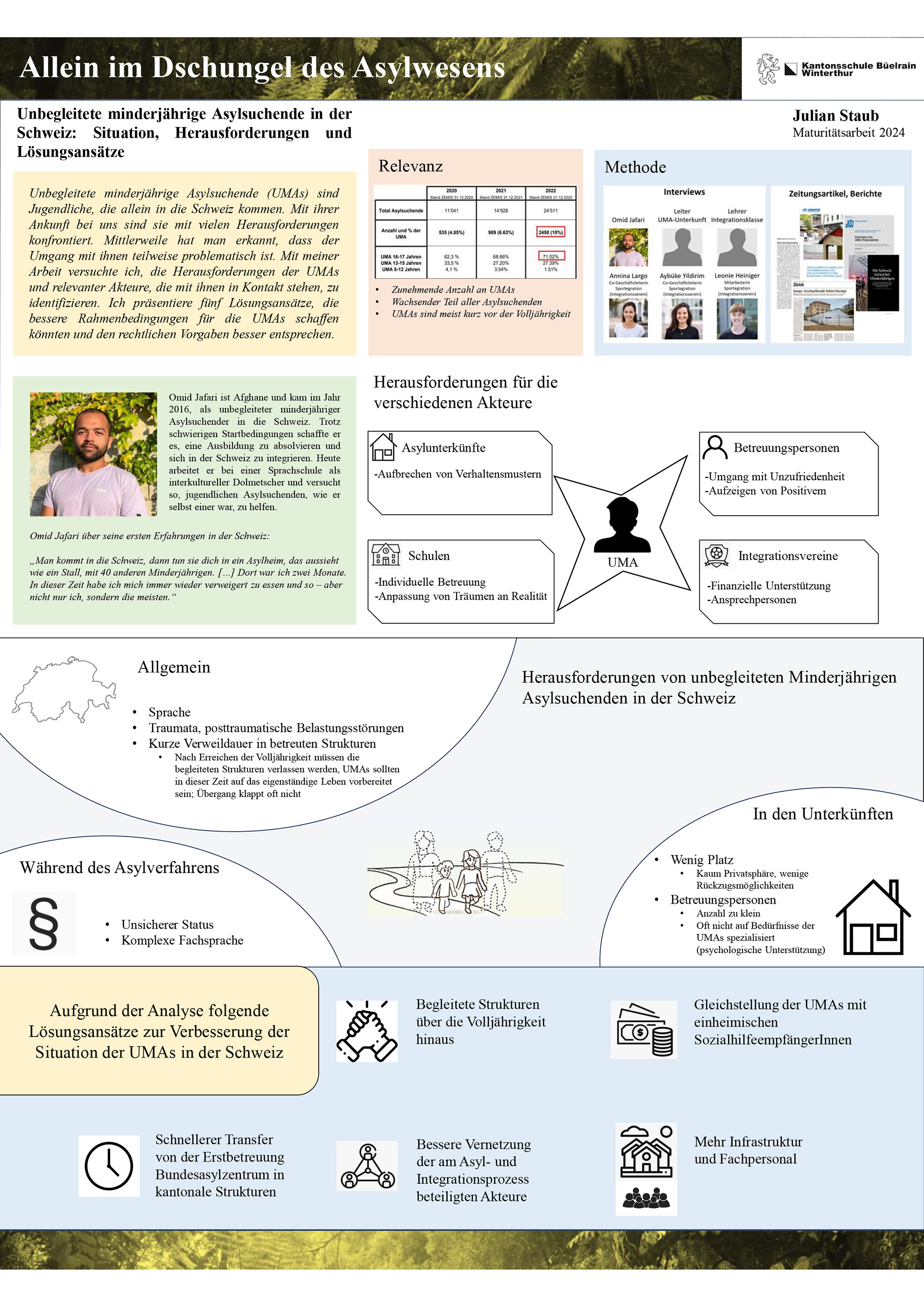 Unbegleitete minderjährige Asylsuchende (UMAs) sind jugendliche Flüchtlinge, die allein in die Schweiz kommen. Mit ihrer Ankunft bei uns sind sie mit vielen Herausforderungen konfrontiert. Mittlerweile hat man erkannt, dass der Umgang mit ihnen teilweise problematisch ist. Ziel meiner Arbeit war es, die Herausforderungen der UMAs und relevanter Akteure, die mit ihnen in Kontakt stehen, zu identifizieren. Dazu habe ich sechs Interviews geführt: mit einem ehemaligen UMA, mit einem Leiter einer UMA-Unterkunft, einem Lehrer einer Integrationsklasse sowie mit drei Vertreterinnen eines Integrationsvereins. Aus diesen Interviews, verschiedenen aktuellen Studien, Medienberichten und rechtlichen Grundlagen habe ich wesentliche Aspekte der aktuellen Situation identifiziert. Davon habe ich fünf Lösungsansätze abgeleitet, die bessere Rahmenbedingungen für die UMAs schaffen könnten und so den rechtlichen Vorgaben besser Rechnung tragen würden. Dazu gehören der Aufbau von begleiteten Strukturen für UMAs über ihre Volljährigkeit hinaus, ein möglichst frühzeitiger Transfer von UMAs von den Auffangzentren des Bundes mit ihrer limitierten Betreuungskapazität in die besseren Betreuungsstrukturen der Kantone oder mehr Fachpersonal, das die UMAs bei der Bewältigung ihrer traumatischen Erfahrungen unterstützen kann.
