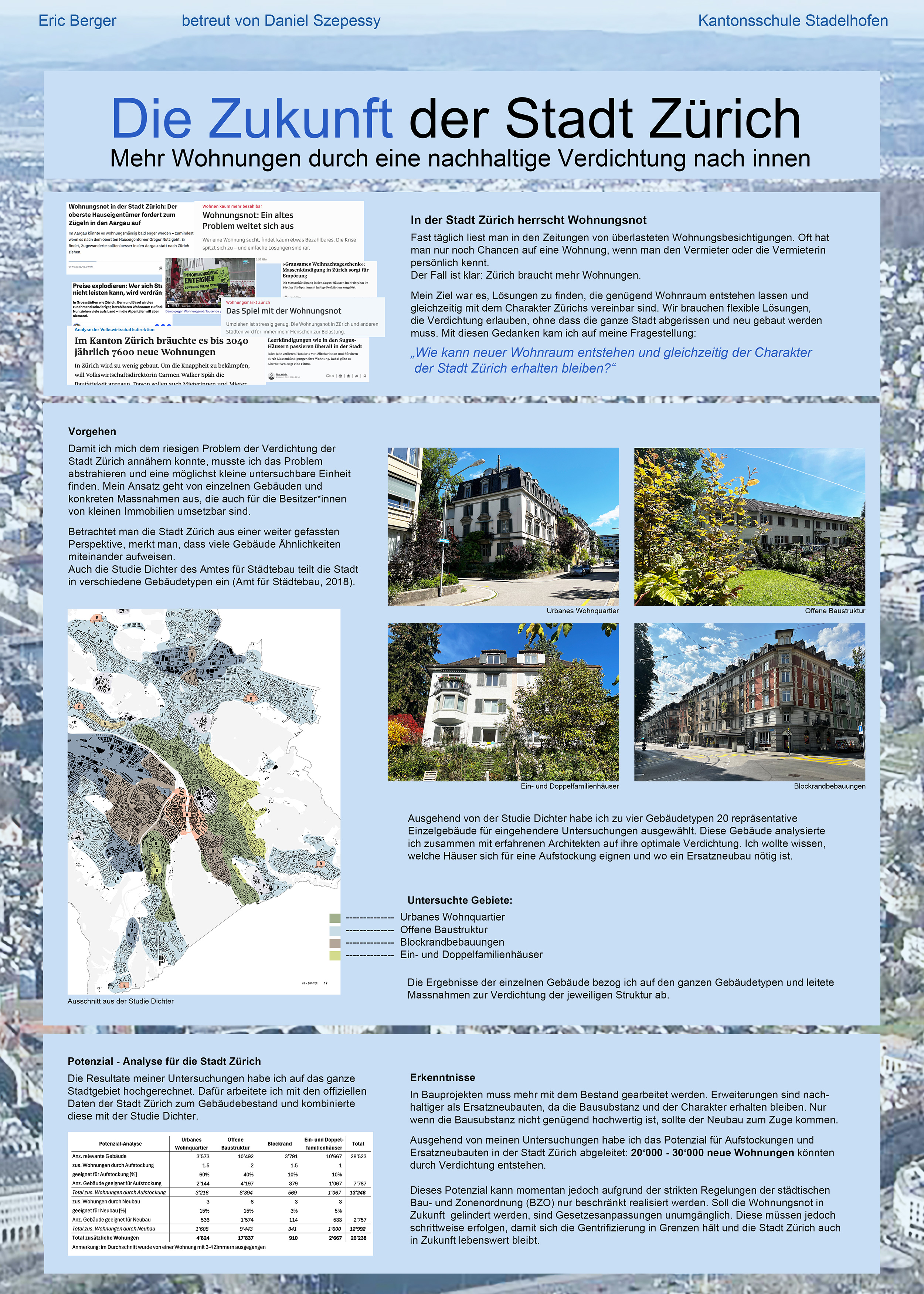 Mit einer Leerwohnungsziffer von 0.07 Prozent herrscht in der Stadt Zürich eine akute Wohnungsnot. Immer wieder liest man in den Zeitungen von komplett überlasteten Wohnungsbesichtigungen. Der Fall ist klar: Zürich braucht mehr Wohnungen. Die Raumplanung fordert eine Siedlungsentwicklung nach innen. Es soll neuer Wohnraum entstehen, ohne dass neues Land verbaut wird. Wie geht das? Und wie wird Zürich in Zukunft aussehen? Mit diesen Fragen habe ich mich in meiner Maturitätsarbeit befasst.
