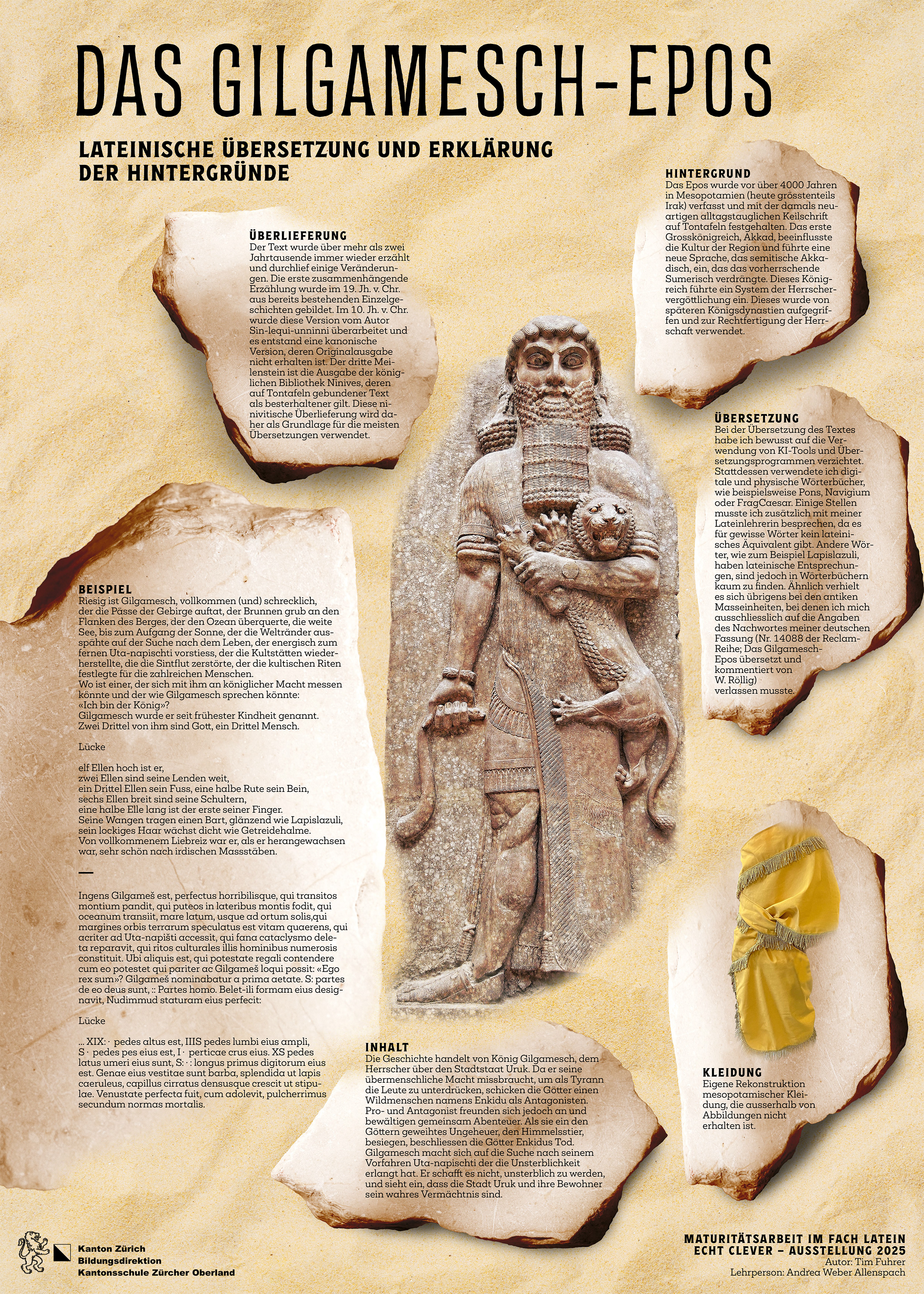 Die Arbeit hatte zwei Ziele: Die Übersetzung der ersten und elften Tafel des Gilgamesch-Epos einerseits und andererseits eine präzise Darlegung des historischen Hintergrunds und einer umfassenden Inhaltsangabe. Ich begann mit der Übersetzung, noch bevor ich ausgiebige Recherchen zum Epos selbst und dem Gebiet Mesopotamien angestellt hatte. Ich verwendete verschiedene Wörterbücher, lehnte jedoch jegliche Übersetzungsprogramme oder KI-Systeme vehement ab. Schwierige Passagen übersetzte ich und präsentierte sie dann meiner Betreuungslehrerin, um die Formulierungen zu verfeinern. Nachdem die Übersetzungsarbeit vollbracht war, setzte ich mich an die Recherchen zum alten Mesopotamien. Dazu verwendete ich Bücher von professionellen Altorientalistinnen, Assyriologen und anderen Spezialisten, was mir mehrheitlich die Unannehmlichkeiten, die mit Internetquellen einhergehen, ersparte. Als ich sowohl mit der Inhaltsangabe, in die ich all mein Schreibtalent gesteckt hatte, als auch mit der Erläuterung der Historie fertig war, die ich angesichts der schieren Informationsmenge noch weiter eingeteilt hatte, machte ich mich an ein zusätzliches Projekt. Ich schrieb einer bekannten Altorientalistin und bat um Auskünfte über mesopotamische Kleidung. Sie leitete mich weiter an eine Assyriologin, die auf antike Gegenstände spezialisiert ist, welche mir drei Papers mit einer Gesamtlänge von etwa 1500 Seiten schickte. Diese las ich (teilweise zugunsten der Effizienz auch nur partiell), erstellte ein Schnittmuster und stellte für den Vortrag zu meiner Arbeit ein rekonstruiertes Wickelgewand samt Sandalen her.