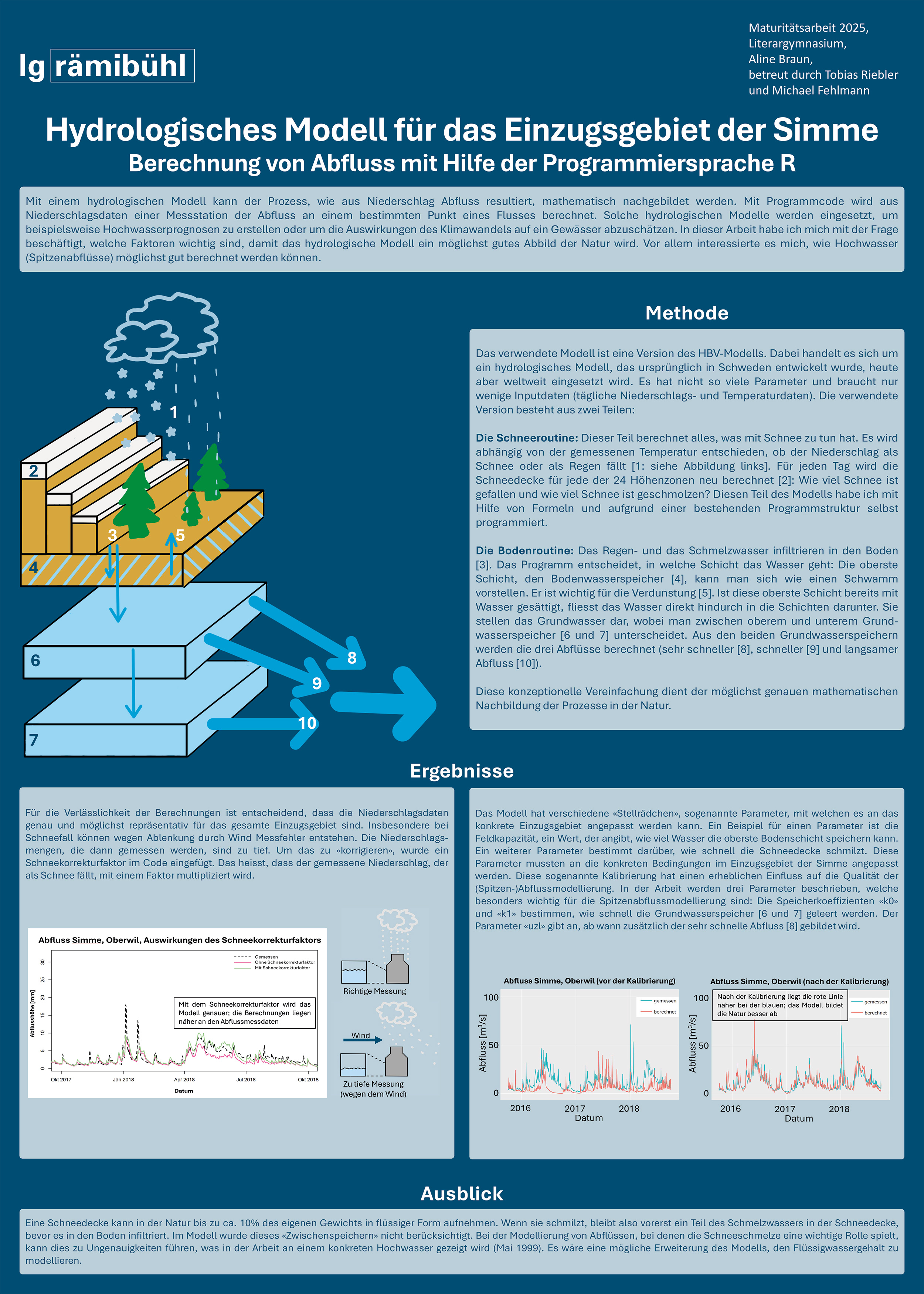 In dieser Arbeit ging es darum, für das Einzugsgebiet eines Flusses aus Niederschlagsdaten Abfluss zu berechnen. Dafür wurde ein hydrologisches Modell verwendet und auf das Gebiet der Simme, eines Flusses im Berner Oberland, angepasst. Hydrologische Modelle werden eingesetzt, um Hochwasserprognosen zu erstellen oder um die Auswirkungen des Klimawandels auf ein Gewässer abzuschätzen.