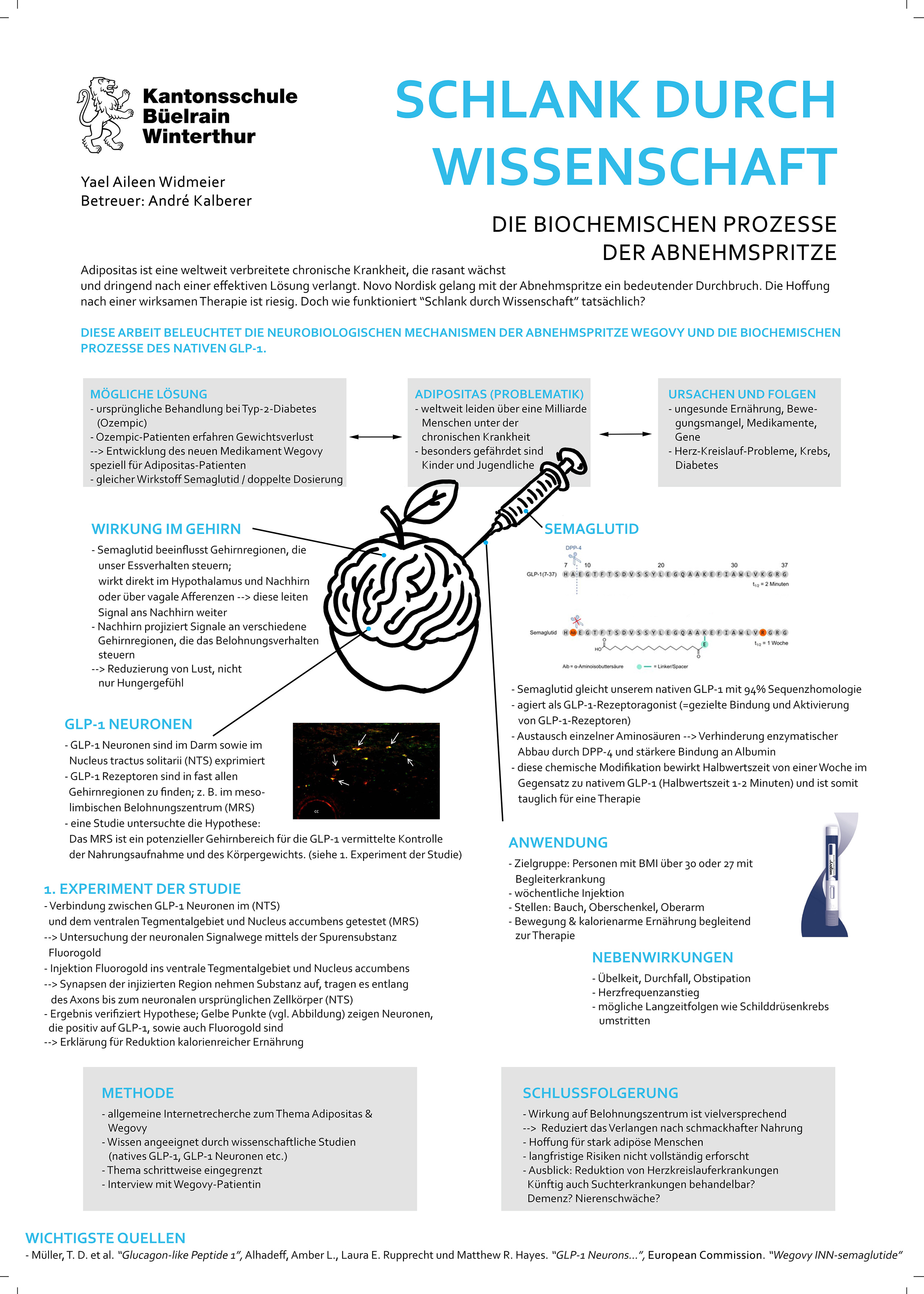 Adipositas ist eine weltweite verbreitete chronische Krankheit, die rasant wächst und dringend nach einer effektiven Lösung verlangt. Mit der Erfindung der Abnehmspritze erzielte Novo Nordisk einen bedeutenden Durchbruch. Doch wie funktioniert „Schlank durch Wissenschaft“ tatsächlich? Diese Arbeit hat das Ziel, die neurobiologischen induzierten Mechanismen in unserem Körper durch die Abnehmspritze, sowie die biochemischen Prozesse des natürlichen GLP-1 verständlicher zu machen. Dazu habe ich mich mit einer umfassenden Studie über GLP-1 auseinandergesetzt, im Internet nach weiteren Quellen recherchiert und mich ebenfalls mit weiteren Studien befasst. Zudem soll ein Einblick in die therapeutische Verwendung von Wegovy durch die persönlichen Erfahrungen einer Patientin gegeben werden. Die Erkenntnis, dass sich unser Gehirn ebenfalls an der Kontrolle der Nahrungsaufnahme beteiligt, ist von grosser Bedeutung. Insbesondere die Verbindung zwischen dem mesolimbischen Belohnungszentrum und den GLP-1 produzierende Neuronen im Nucleus tractus solitarii unterstreicht die zentrale Rolle von GLP-1. Dies reduziert das Verlangen nach schmackhafter und fettreicher Nahrung. Die innovative Entwicklung verspricht eine meistens erfolgreiche Gewichtsabnahme. Jedoch ist auch Vorsicht geboten, denn schwerwiegende Nebenwirkungen auf lange Sicht können noch nicht sicher ausgeschlossen werden, für das ist die Dauer der Therapie noch zu kurz.
