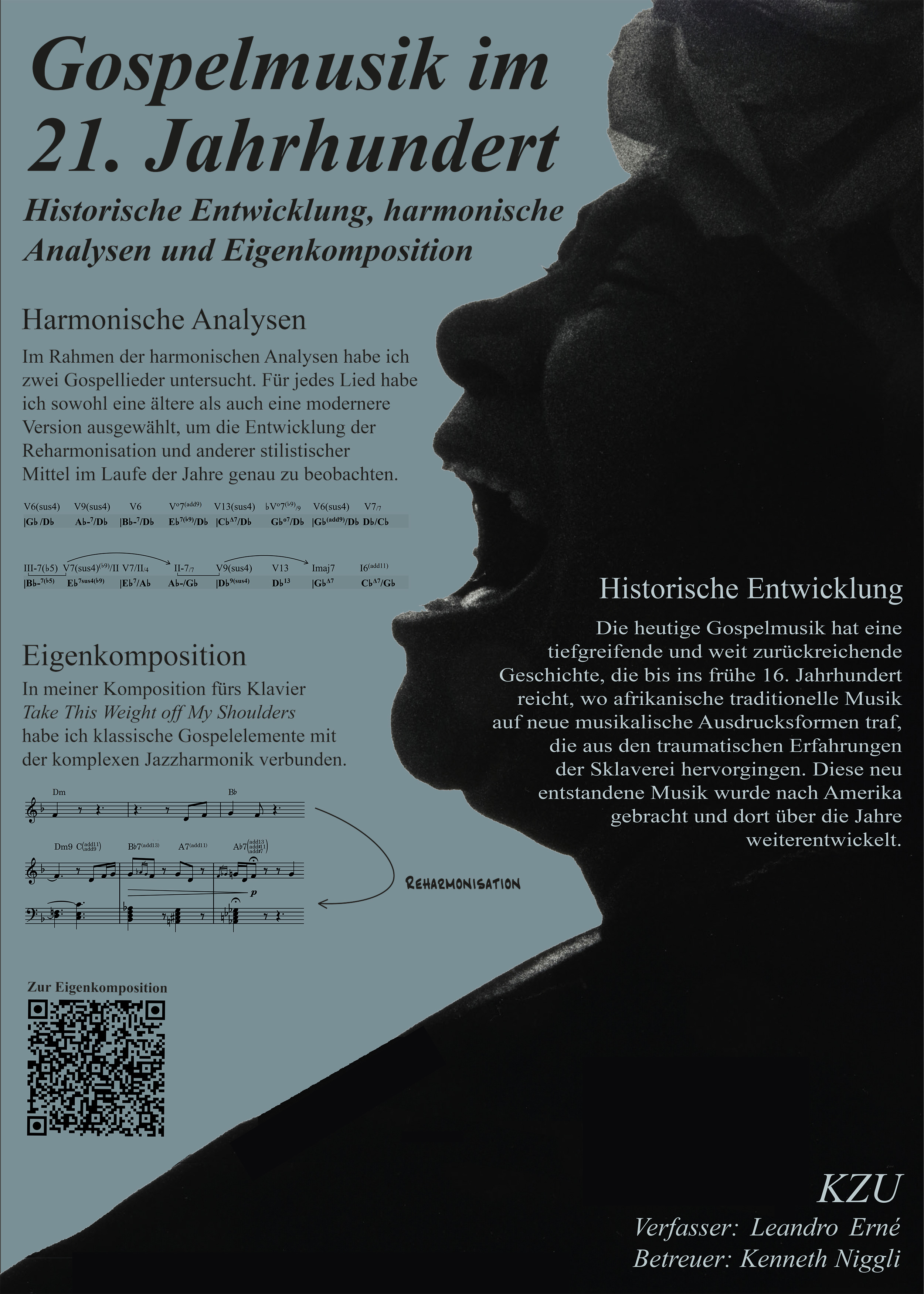 In meiner Maturitätsarbeit habe ich mich mit der faszinierenden Verbindung von Gospel- und Jazzmusik beschäftigt. Im Zentrum steht meine eigene Komposition eines Jazz-Gospel-Stücks für Klavier, in der ich sowohl die historischen Wurzeln als auch moderne Entwicklungen der Gospelmusik widerspiegeln wollte. Ergänzend dazu habe ich einen kurzen historischen Überblick erarbeitet und zwei bekannte Gospellieder – jeweils in einer älteren und einer modernen Version – harmonisch analysiert. So konnte ich die stilistische Entwicklung der Gospelmusik und insbesondere den Einfluss des Jazz nachvollziehen. Die gewonnenen Erkenntnisse liess ich direkt in meine Eigenkomposition Take This Weight off My Shoulders einfliessen. Ich begann mit einem einfachen Leadsheet und entwickelte daraus Schritt für Schritt ein arrangiertes, annotiertes und analysiertes Stück. Dabei setzte ich gezielt jazztypische Reharmonisationen, improvisatorische Elemente und stilistische Mittel ein. Besonders viel habe ich im Umgang mit Notationssoftware, in der detaillierten Analysearbeit und beim strukturellen Aufbau eines vollständigen Werks gelernt. Meine zentrale Frage – wie man eine Jazz-Gospel-Komposition schreibt, die sowohl harmonische Komplexität als auch das typische Gospel-Feeling enthält – konnte ich erfolgreich beantworten. Theorie, Analyse und Kreativität sind dabei zu einem persönlichen musikalischen Werk verschmolzen.