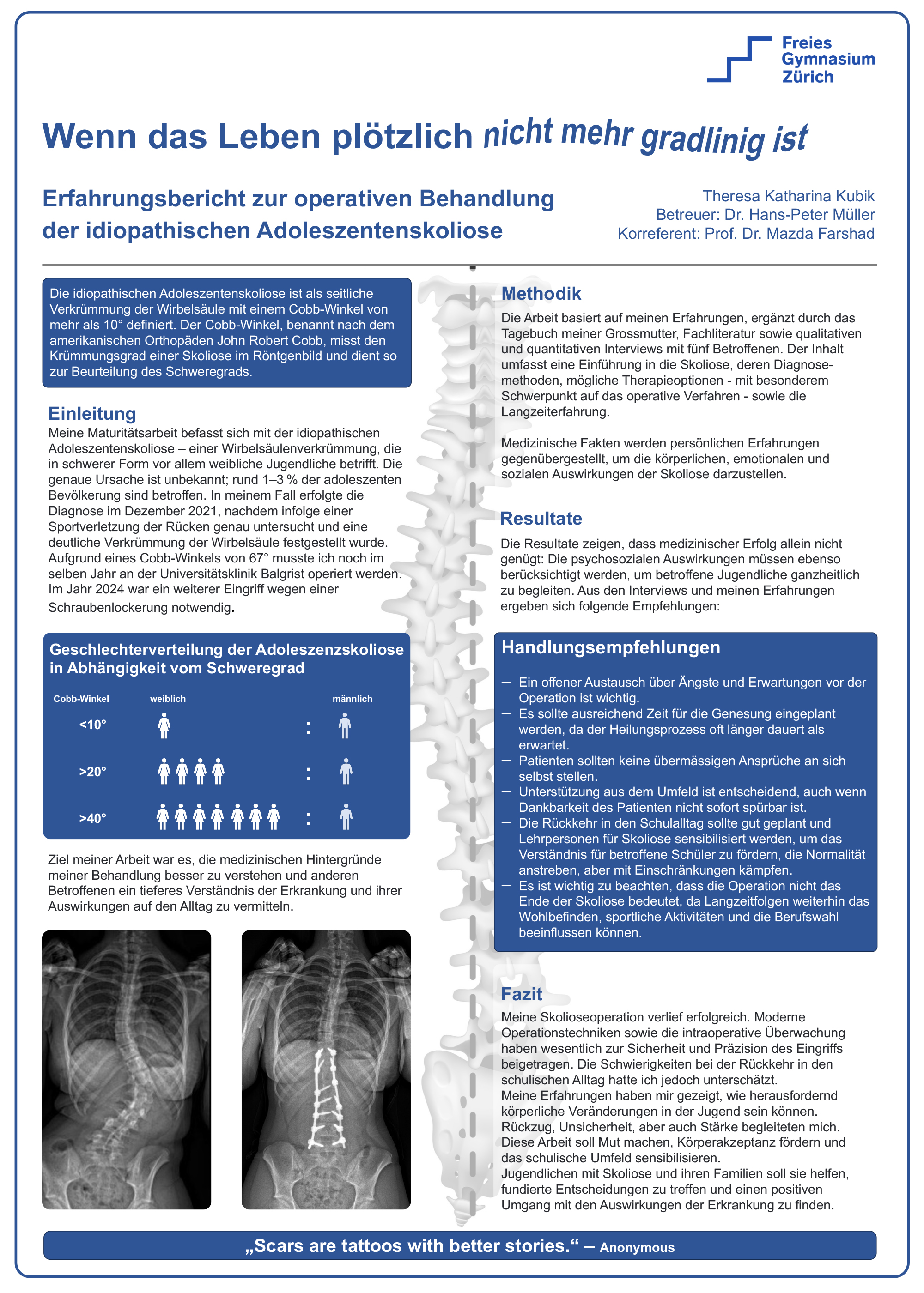 In meiner Maturitätsarbeit setze ich mich mit der idiopathischen Adoleszentenskoliose auseinander – einer Wirbelsäulenerkrankung, von der ich selbst betroffen bin. Ziel war es, medizinische Grundlagen, diagnostische Verfahren, Therapieoptionen sowie psychische und soziale Auswirkungen wissenschaftlich fundiert aufzuarbeiten. Die Methodik basiert auf einer Literaturrecherche, der Analyse meiner persönlichen Krankengeschichte, qualitativen Interviews mit weiteren Betroffenen sowie der statistischen Auswertung standardisierter Fragebögen (SRS-22). Besonders wertvoll war die Verbindung zwischen medizinischer Fachinformation und persönlichen Erfahrungen, wodurch die Realität Betroffener ganzheitlicher erfasst werden konnte. Neben dem fachlichen Erkenntnisgewinn kann die Arbeit mit konkreten Handlungsempfehlungen wesentlich zur Sensibilisierung meines schulischen Umfelds beitragen – insbesondere in Hinblick auf den Umgang mit den emotionalen und körperbezogenen Unsicherheiten, die viele Jugendliche in einer sensiblen Phase ihrer Entwicklung erleben. Die Reflexion meines eigenen Weges hat mir nicht nur zu mehr Selbstakzeptanz verholfen, sondern auch verdeutlicht, dass Aufklärung, Empathie und offene Gespräche zentral im Umgang mit solchen Herausforderungen sind.