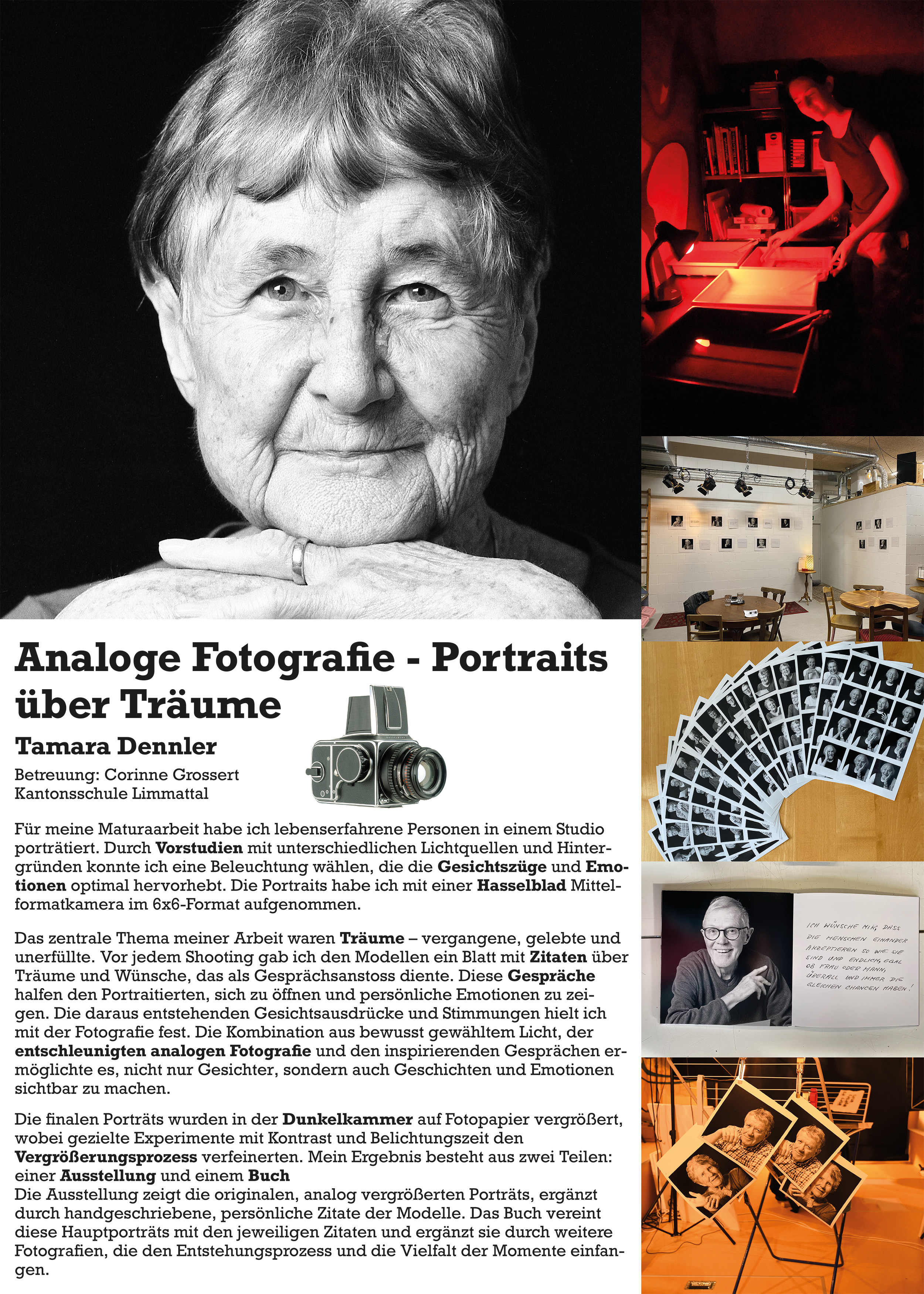 Mein Ausgangspunkt war die Frage, wie sich Lebenserfahrungen in Portraits festhalten lassen und welchen Einfluss der analoge Prozess auf die Bildwirkung hat. Durch die entschleunigte Arbeitsweise der analogen Fotografie wollte ich einen bewussteren Umgang und eine tiefere Verbindung zur Fotografie schaffen. Dafür habe ich mit einer Mittelformat-Kamera gearbeitet, verschiedene Lichtsetzungen ausprobiert und die Bilder in der Dunkelkammer selbst vergrößert. Der bewusste Umgang mit Film, Chemikalien und Belichtungszeiten hat mich nicht nur viel gelehrt, sondern auch die emotionale Wirkung der Aufnahmen verstärkt. Das Ergebnis ist eine Ausstellung und ein Buch, in dem die Portraits zusammen mit einem handgeschriebenen Zitat der jeweiligen Person präsentiert werden.