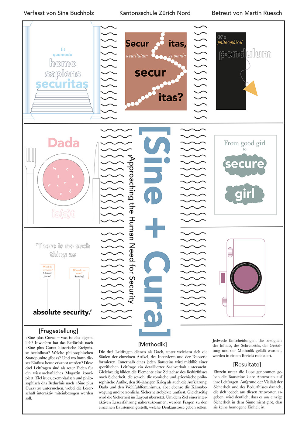 Die Leserschaft trifft auf Fiducia, die zur Form der Sicherheit gemäss Seneca und Epikur werden möchte; lernt barocke Unsicherheit in den Wirren der Vanitas und des 30-jährigen Krieges kennen und untersucht mithilfe eines philosophischen Pendels das «Zeitalter der Sicherheit», die Aufklärung, anhand von Locke und Smith. Sie erlebt das Streben nach Unsicherheit der Dadaist*innen wie auch dasjenige nach Sicherheit der Wohlfühlfeminist*innen des 21. Jahrhunderts, mit dessen Klimabewegung und terroristischen Anschlägen sich die Autorin mit einer Interviewpartnerin auseinandersetzt. Den Kreis schliessen die sechzehn Sicherheitsobjekte, die sich den Leser*innen in der Fotoserie präsentieren. Das Magazin richtet explizite Fragestellungen an die Leserschaft, die sie zum Mit- und Weiterdenken herausfordern und zu einer interaktiven Leseerfahrung ermutigen.