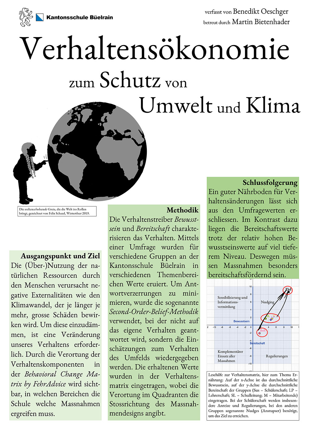 Ziel der Maturitätsarbeit ist es zu ergründen, wie sich das Verhalten von Menschen an Kantonsschulen nachhaltig ändern liesse. Hierfür wurde an der Kantonsschule Büelrain Winterthur sondiert, welche Massnahmen in den Bereichen Mobilität, Ernährung,