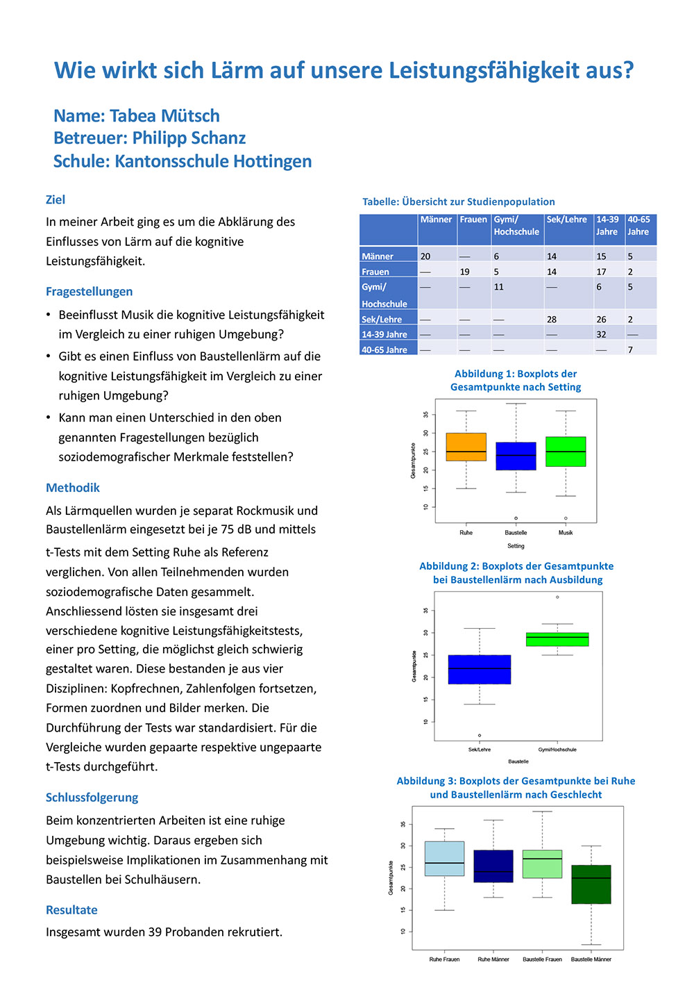 Als Lärmquellen wurden je separat Rockmusik und Baustellenlärm eingesetzt bei je 75 dB und mittels t-Tests mit dem Setting Ruhe verglichen. Ruhe war demzufolge meine Referenz­probe. Von allen Teilnehmenden wurden soziodemografische Daten gesammelt. Anschliessend lösten sie insgesamt drei verschiedene kognitive Leistungsfähigkeitstests. Diese bestanden je aus vier Disziplinen: Kopfrechnen, Zahlenfolgen fortsetzen, Formen zuordnen und Bilder merken. Die Durchführung der Tests war standardisiert.