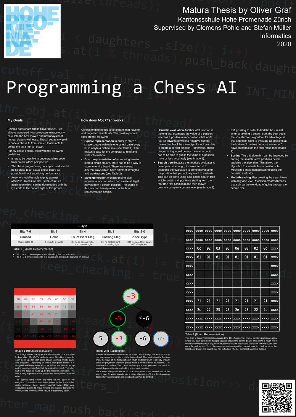 Die Arbeit geht von den Grundpfeilern eines funktionierenden Schachcomputers aus und baut anschliessend ein Bild davon, wie die verschiedenen Teile von Mockfish zusammen­arbeiten und welche Methoden dabei verwendet wurden, um die KI noch effizienter zu machen. Am Ende erklärt die Arbeit ein paar Phänomene, welche Oliver Graf beim Programmieren besonders aufgefallen sind – unter anderem, warum Mockfish auf dem Schachbrett einen überraschend ähnlichen Spielstil wie sein Erschaffer entwickelt hat.