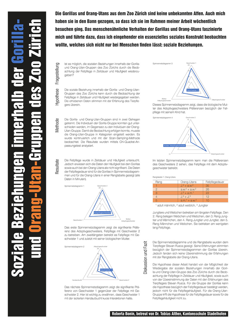 Die anfängliche Beobachtung der Gorillas und Orang-Utans aus dem Zoo Zürich führte zur Frage, ob die Erfassung der sozialen Beziehung innerhalb dieser beiden Gruppen durch die Beobachtung der Fellpflege möglich ist. Beobachtet wurde die Fellpflege in Zeitdauer und Häufigkeit. Dabei sollten die erhobenen Resultate mit der Erfahrung des Tierpflegers S. Rusca übereinstimmen und die bestehenden sozialen Beziehungen wiedergeben können.