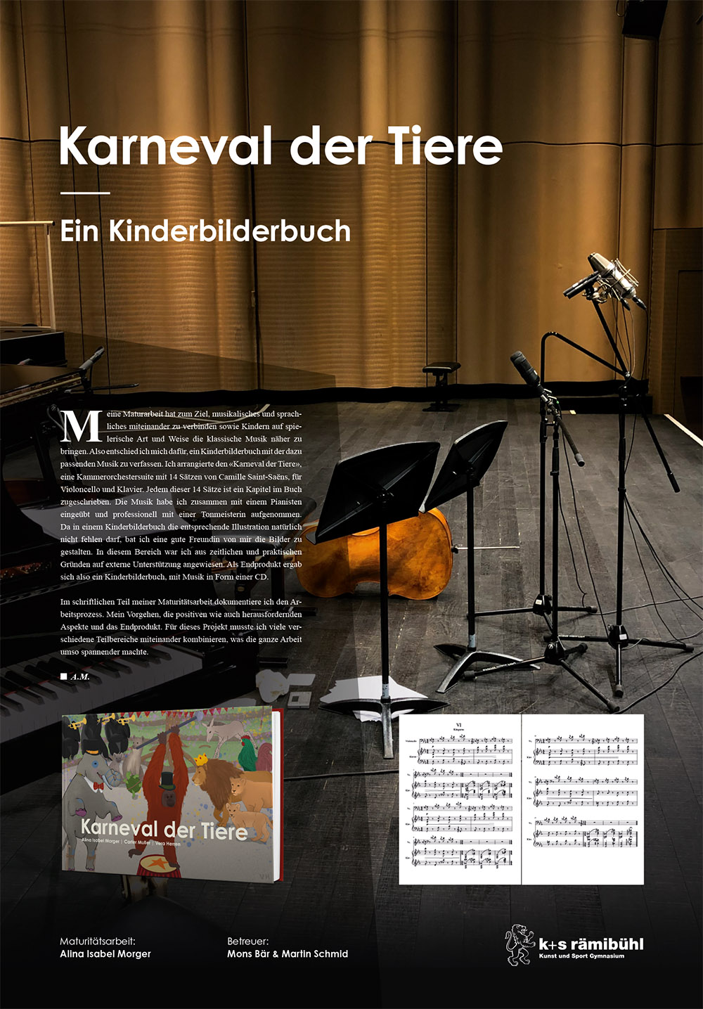 Alina Morger hat in ihrer Maturitätsarbeit Musikalisches und Sprachliches verbunden, um gleichzeitig Kindern auf spielerische Art und Weise die klassische Musik näher zu bringen. Sie hat dazu ein Kinderbilderbuch mit der dazu passenden Musik verfasst. Sie arrangierte den «Karneval der Tiere», eine Kammerorchestersuite mit 14 Sätzen von Camille Saint-Saëns, für Violoncello und Klavier. Jedem dieser 14 Sätze ist ein Kapitel im Buch zugeschrieben. Die Musik hat die Autorin zusammen mit einem Pianisten eingeübt und professionell mit einer Tonmeisterin aufgenommen.
